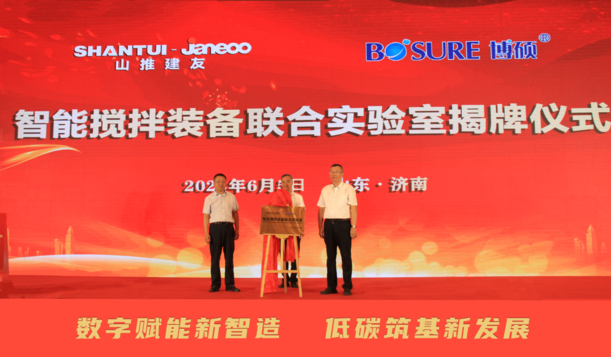 在中國混凝土與水泥制品協(xié)會執(zhí)行會長吳文貴的見證下,山推建友、山東博碩智能攪拌裝備聯(lián)合實驗室揭牌成功。