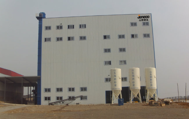 2014年9月,山東客戶采購山推建友1套SjGJD060-3G型干混砂漿站成功應用,用于預拌干混砂漿生產(chǎn)線,目前該設備使用效果良好。該設備料倉位于主樓設備旁邊,計量位于料倉下方,計量完成后經(jīng)輸送機、提升機后送入攪拌機,生產(chǎn)率高,外觀雄偉,適合普通干混砂漿的生產(chǎn)。